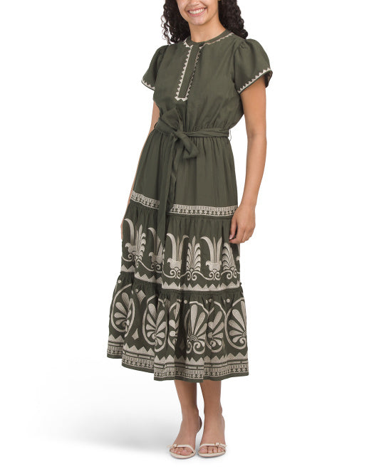 ELIE TAHARI Linen Blend Short Sleeve Tiered Maxi Dress With Belt